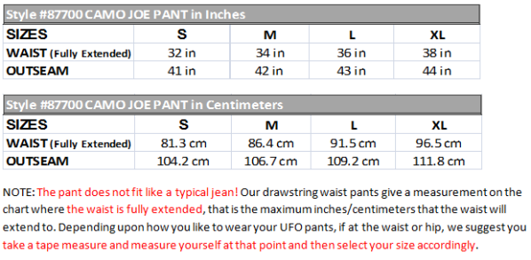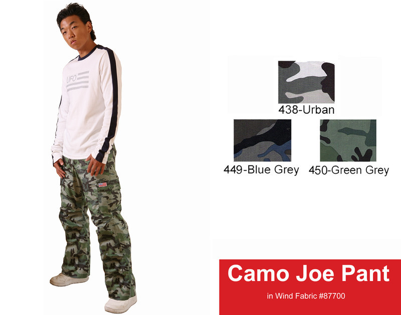 Take charge with the UFO Camo Joe Pant! This unisex slimfit design is a favorite of guys looking for a slimmer style that is still comfortable enough for dance, fitness and street. This pant features the same military camouflage print as our Classic Camo Wind Pant, a drawstring waist, plenty of storage with two single button top pockets with flap closures, cargo pockets at the side with single flap closures, knee pleats for a good range of motion, a rear pocket with a single button flap closure, signature tapes at the cargos, bar tacks that reinforce all pockets, and adjustable drawstring bottoms. Made from 65% Poly and 35% Cotton. Machine washable.