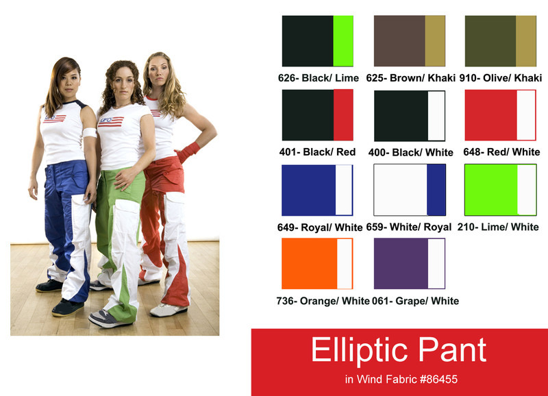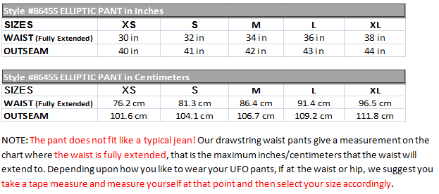 The UFO Elliptic Pant is fun, flirty, and a great addition to any dance wear, fitness wear, street wear or EDM rave wear wardrobe! This style accentuates your girly figure with a higher rise that fits off the high hip to waist and a slimmer fit that hugs your hips. This pant features a drawstring waist, two single button top flap pockets, an elliptic shaped inset in a contrast color that matches your cargo pockets on legs, signature UFO tapes at cargo pockets, knee pleats for flexibility, back darts for a slimmer fit, right rear pocket with a single button closure, and drawstrings at the hem allow you to customize the length of your pant. Made from 65% Poly and 35% Cotton. Machine washable.