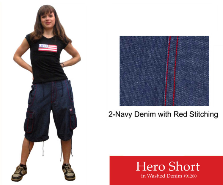 What happens when we take a classic cargo short and give it a makeover? We get a hip style called the UFO Hero Short! Crafted from 100% cotton denim, the fabric has been prewashed with enzymes for a softer finish that looks and feels great! This unisex dark blue denim short features a more tapered fit than our UFO Wind Short, contrast red stitching, drawstring waist, top flap pockets with velcro closure, pleated cargo pockets with contrasting red UFO tapes, back flap pocket with a Velcro closure, and an adjustable drawstring bottom, making it perfect for dance, fitness, street and EDM wear. Machine washable.