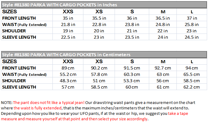 We understand styles can change with the weather but the unisex UFO Parka is one of the convertible pieces UFO is known for! This jacket is equipped with a hood, Velcro closures, drawstring at the waist and bottoms, elastic cuffs, two large cargos with signature twill tapes, and a fishtail back. You can convert your long-sleeved parka into a 2-in-1 short jacket as the fishtail back can tie over the shoulder and also transform into a functioning short jacket with backpack! This parka packs flat for easy storage. Made from our famous Wind Fabric of 65% Poly and 35% Cotton, the Parka is lightweight, machine washable, and comfortable to wear!
