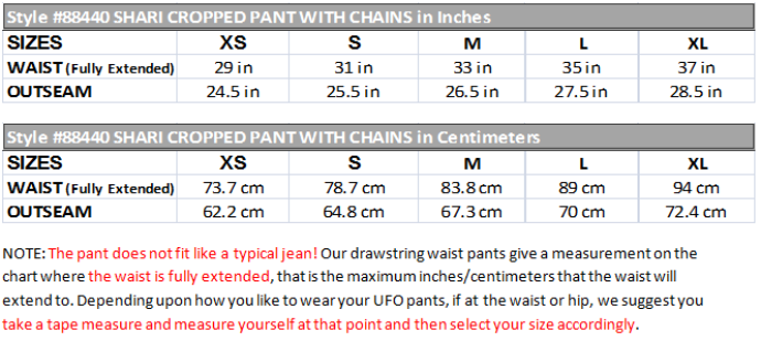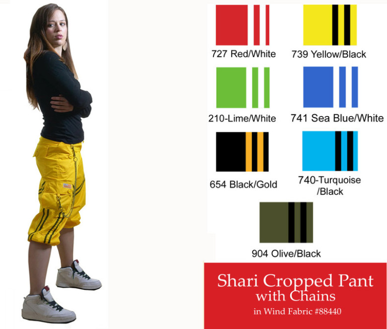 Who doesn’t love to accessorize?! We added removable chains to our UFO Shari Cropped Pant. In addition to the loops and chains provided, you can add your own personality to the loops with trinkets, key chains, laces, ribbons, you name it! Fitted like our regular Cropped Drawstring Pant, this style sits at the mid to high hip, making it possible for you to move comfortably! It is perfect for dance wear, fitness wear, EDM wear and street wear. It also features an adjustable drawstring waist, top stylized pockets with button closures, double buttoned side cargo pockets with a hole at the gussets for our signature UFO tapes, a rear pocket with a single button flap closure, back darts for a sexier slimming look, drawstrings at the bottom, and a contrasting stripe design on the front and back of legs and angled stripes at the thighs. This pant is made from 65% Poly and 35% Cotton and is safe to wash!