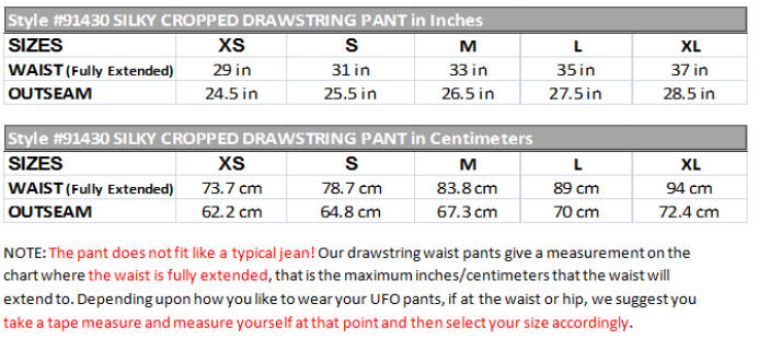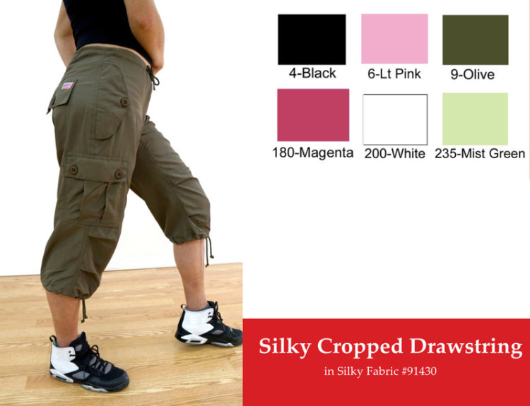 Ladies do away with ordinary and slip into our UFO Silky Cropped Drawstring Pant! The soft and draping fabric and the classic cropped cargo pant style offers versatility perfect for dance wear, fitness wear, casual every day street wear or EDM wear.This pant features a drawstring waist that slings off your mid to high hip, two single button flap pockets at the front, two double button pleated side cargo pockets, a right rear pocket with button closure, cross seamed details above and below the knee area, knee pleats for flexibility, and drawstrings you can adjust the length of the pant with. Made from 100% Poly, you’ll never want to take them off! These pants are machine washable.