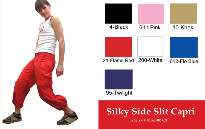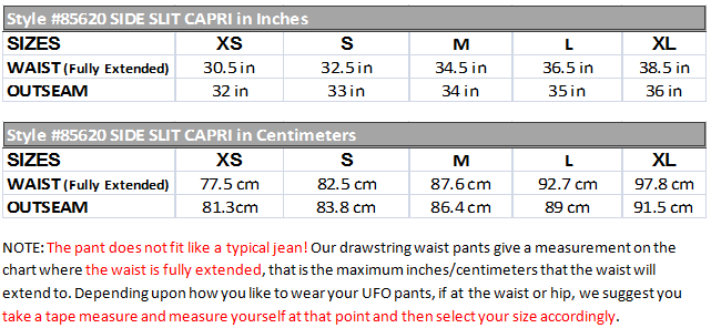 Look and feel as fabulous as as the UFO Side Slit Capri! This fitting style has a low drawstring waist that is very flattering off your high hip! Made from soft and draping 100% Poly, you’ll feel like you’re walking on a cloud, or better yet, dancing on one! This design is a girly style that is slightly longer than our other cropped styles. It features slits at the bottom of the leg which lead to drawstring closures at the bottom you can wear flared or tied, drawstring waist, two military shaped button flap pockets, cross seams at the sides give way to the military closure flaps on the cargos with the twill tapes that can be shown from the buttonholes within the gussets, back darts for the more feminine flair, one rear pocket, and a drawstring bottom, making it a pant versatile enough to meet any of your dance wear, fitness wear, street wear or EDM wear needs. Made from 100% Poly. Machine washable.