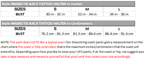 Show off your curves with the UFO Tie Back Tattoo Halter! This halter top features a unique tattoo styled tribal outlined in a contrast mono color, UFO signature twill tape tie back neck and three sets on back of halter, and darts running down the front for a flattering fit. You can adjust exactly how loose or tight you would like this halter to fit for optimal comfort, making this halter versatile enough for dance wear, fitness wear, street wear or EDM rave wear! Made from 65% Poly, 35% Cotton. Machine washable.